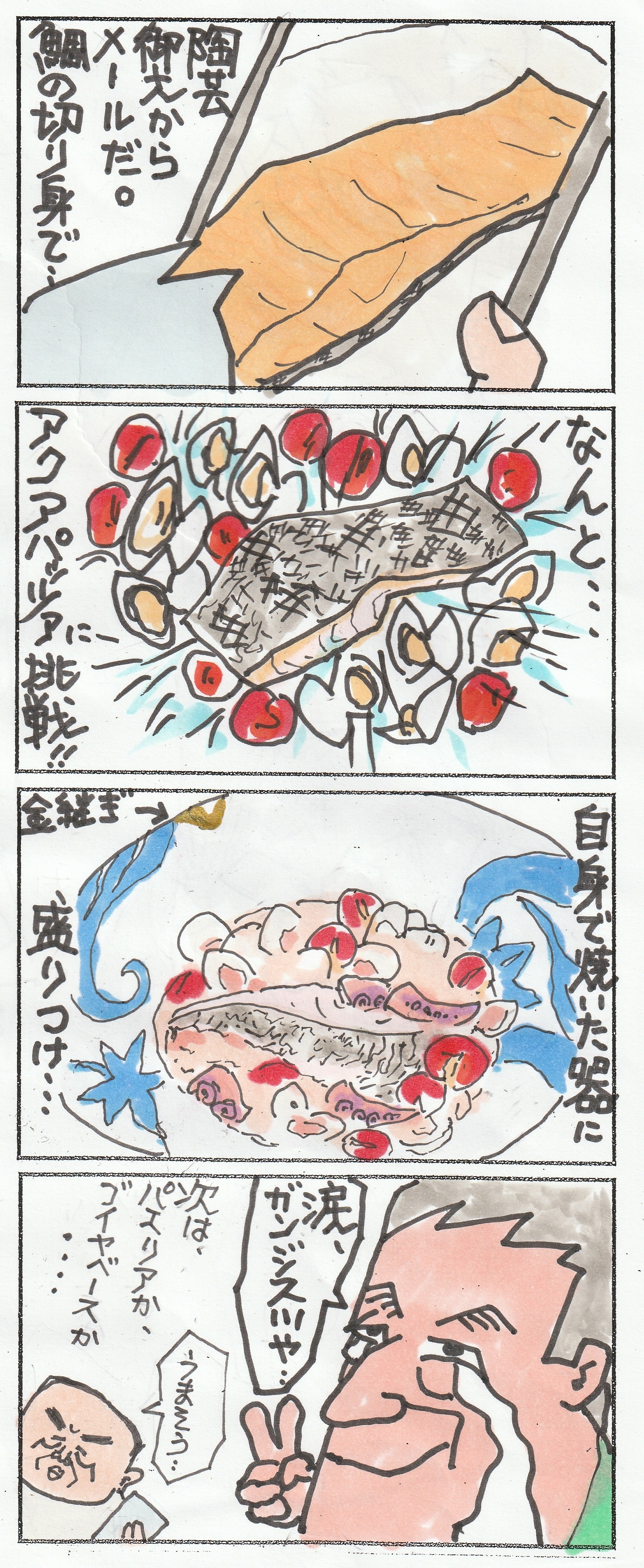 その料理を陶芸御大は、作って、自作の器に盛り付け、、