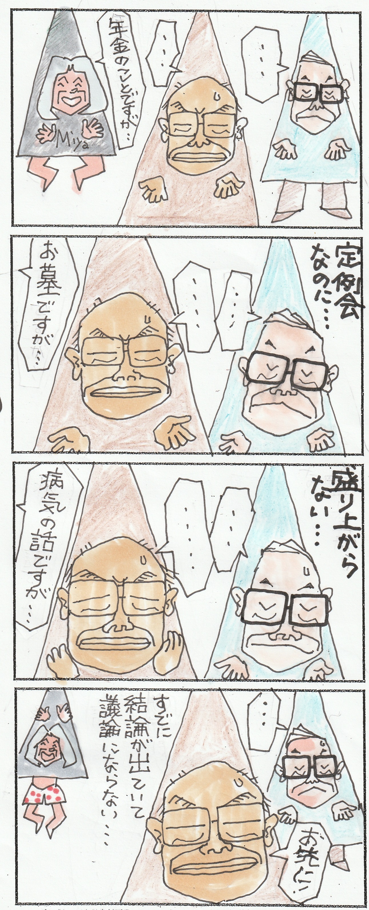ナリヒラ先生・・ 語らず!! 2021年10月18日 00:00 ナリヒラ先生から、ラインだ。今回は、、そのまま漫画にさせて いただいた。以下、、原文!5~60代のころ、仲間が集まると、年金、墓、病気の話題が多かった。それが、70代なったら年金、墓、病気の話をほとんどしなくなる。何故か?年金。みんな、もう受給中で、額も決まっていて、議論する意味がない。墓。すでに、入る墓が決まっているか、手配済みである。病気。ほとんどが、がん、心臓病、腎臓病など、なんらかの病気にかかっていて、病気にかなり詳しい。なるほど。僕も、同年代では あるが、、この3つ、、いずれも当てはまらない・・どうも、、周回遅れ のような気がする・・いいや、この 周回遅れは、、良しとしよう カテゴリなしの他の記事 < 前の記事次の記事 > コメント コメントフォーム 名前 コメント 記事の評価 リセット リセット 顔 星 情報を記憶 コメントを投稿する