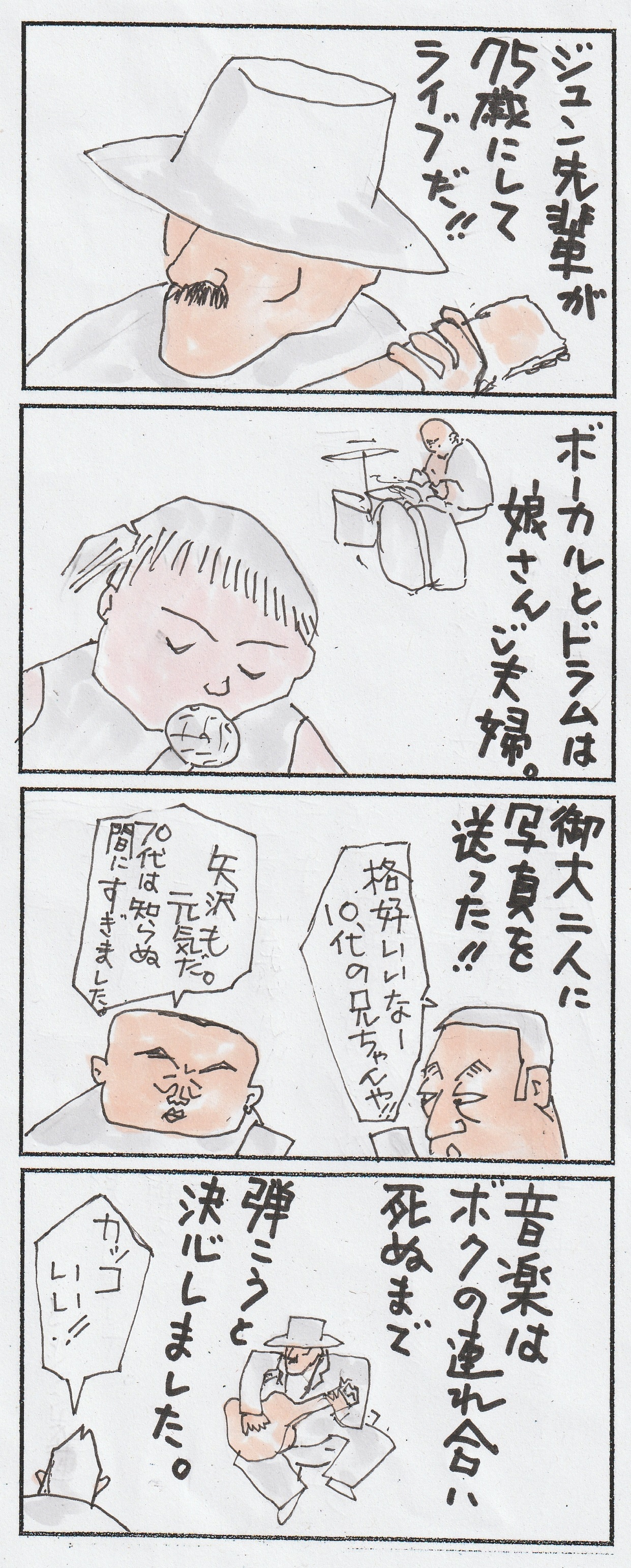 75歳にして・・ ライブ!! 2022年06月29日 05:32 ジュン先輩から、、ライブの案内がきた。先輩は、、昔、一世を風靡した YAMAHAポプコンの、、第一回の優勝者だ。しかも、花形のギター担当。万難を排して 週末のライブに行った。エレキギターは、アコースティックの12弦に変わっていたが、、今も ギター教室で、、何十人もの 生徒に教えている身。久しぶりに 演奏テクニックの 健在ぶりを 堪能させてくれた。バンドは ボーカルとベースを娘さんがやり、、ドラムは 娘さんのご主人という、、なんともアットホームな トリオ。こんなライブなら、、音楽に 縁が薄い僕でも、、十分に 楽しめる。翌日 届いた ラインには、、死ぬまで 弾き続ける・・と。素晴らしい!!! カテゴリなしの他の記事 < 前の記事次の記事 > コメント コメント一覧 (2) 1. しげうさぎ 2022年06月29日 08:14 中島みゆき、八神純子、渡辺真知子・・などなど錚々たるアーティストを生み出したポプコン優勝って!💦ハンパないよね~😅そんな人がそばに居たなんて!👍️😉 0 hidemaro260 がしました 2. じゅん 2022年06月29日 09:29 多少、誤解があるようなので 説明します。 ポプコン優勝とありますが、 ボクが出場したのは1967年開催の 第一回ヤマハライトミュージック コンテストで、これがのちの ポプコンに変わり、 それがまたライトになり またポプコンにという変遷を経ます。 ボクらのバンドは予選を通過し 関東甲信越の代表に選ばれ、 厚生年金大ホールの決勝大会へ。 1450バンドが競う熾烈な ロック部門の最高位になりました。 メンバーのピアノの本田竹彦さんは のちに渡辺貞夫さんのトリオでの 活躍やネーティブサンを結成し、 一世を風靡しました。 (本田さんがほぼプロ的に活動 していたことがアマチュア規定に 触れ、優勝ではなく一位該当なしの 最高位になりました。) ボクはそのバンドのリードギター 担当でした。 もう錆びついた話ですが これが真実です。 0 hidemaro260 がしました コメントフォーム 名前 コメント 記事の評価 リセット リセット 顔 星 情報を記憶 コメントを投稿する